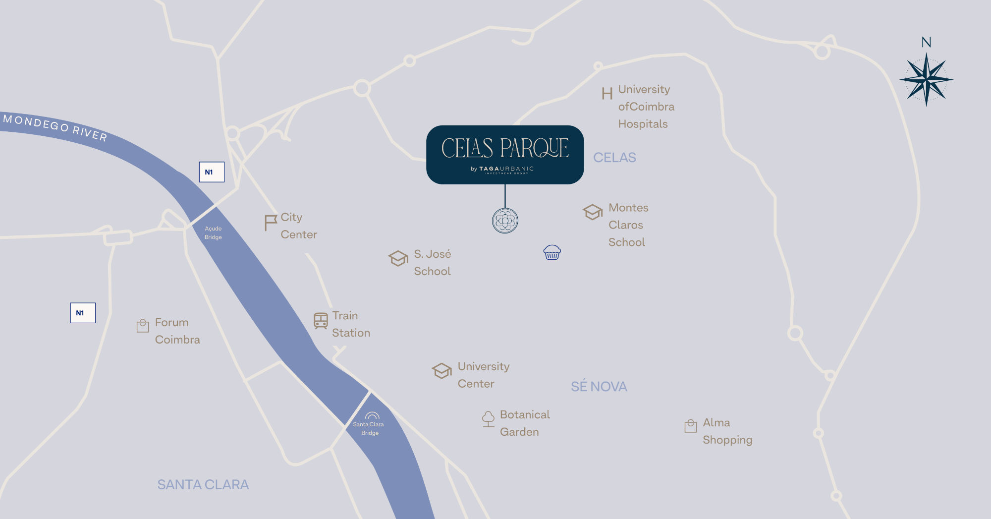 Celas is one of Coimbra’s most established and well-connected areas, where everything you need is always within reach. From universities and hospitals to everyday services, the city unfolds naturally around you.